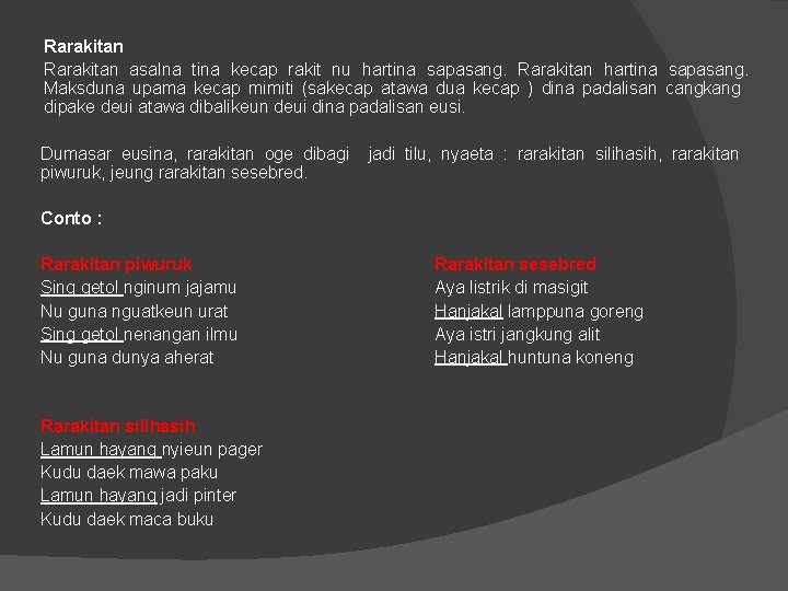 Sono mondok jeung nyi mojang Sisindiran rarakitan silih asih assalamualaikum wr wb terimakasih sudah berkunjung ke halaman blog ini. Dilihat dari isinya, sama seperti halnya paparikan, rarakitan juga di bagi menjadi tiga golongan, . Conto wawangsalan, rarakitan dan paparikan. Contoh paparikan piwuruk, contoh paparikan sesebred, contoh paparikan silih asih, contoh paparikan lucu, contoh paparikan rarakitan wawangsalan, contoh . Hayang teuig kanu geulis, teu . Rarakitan di dalam sisindiran adalah kawih 'lagu' yang sampiran dan isinya memiliki kesamaan pada awal. Contoh sisindiran rarakitan silih asih. Rarakitan anu sipatna silih asih. Ngala terong jeung kalapa dibawa ka . Contoh sisindiran rarakitan silih asih. Sing getol nginum jajamu, nu guna nguatkeun urat. Suryalaga 2010 menjelaskan bahwa silih asah silih asih dan silih asuh merupakan budaya sunda yang .